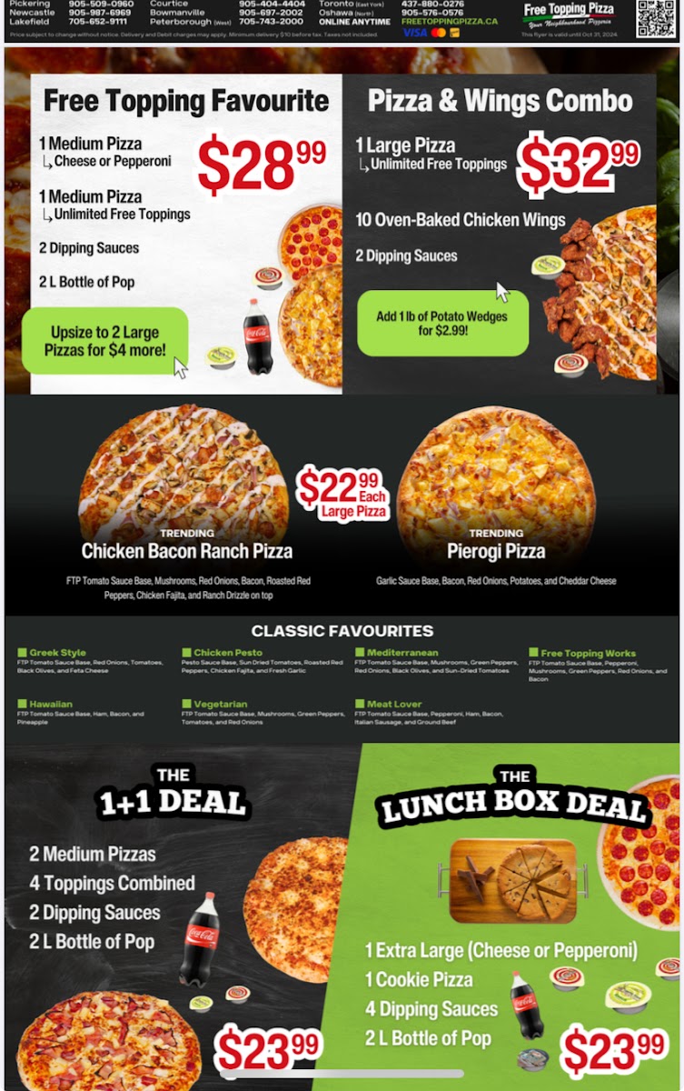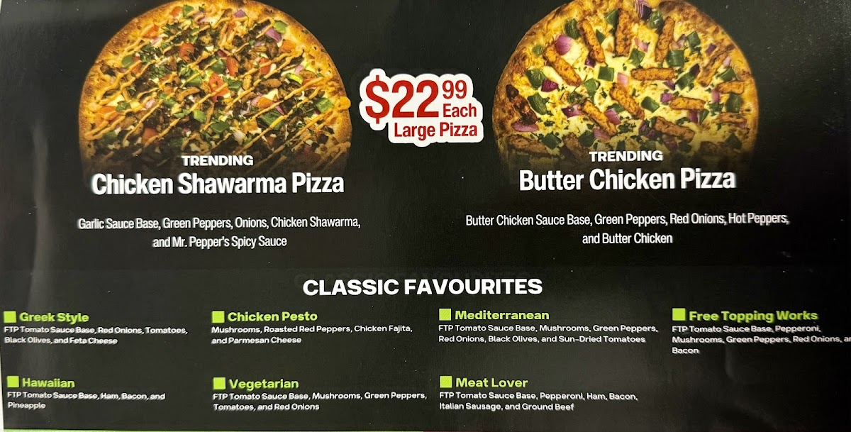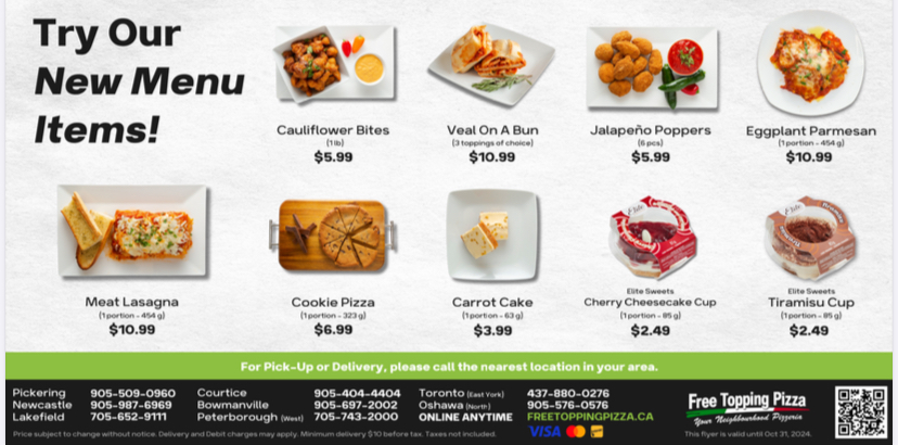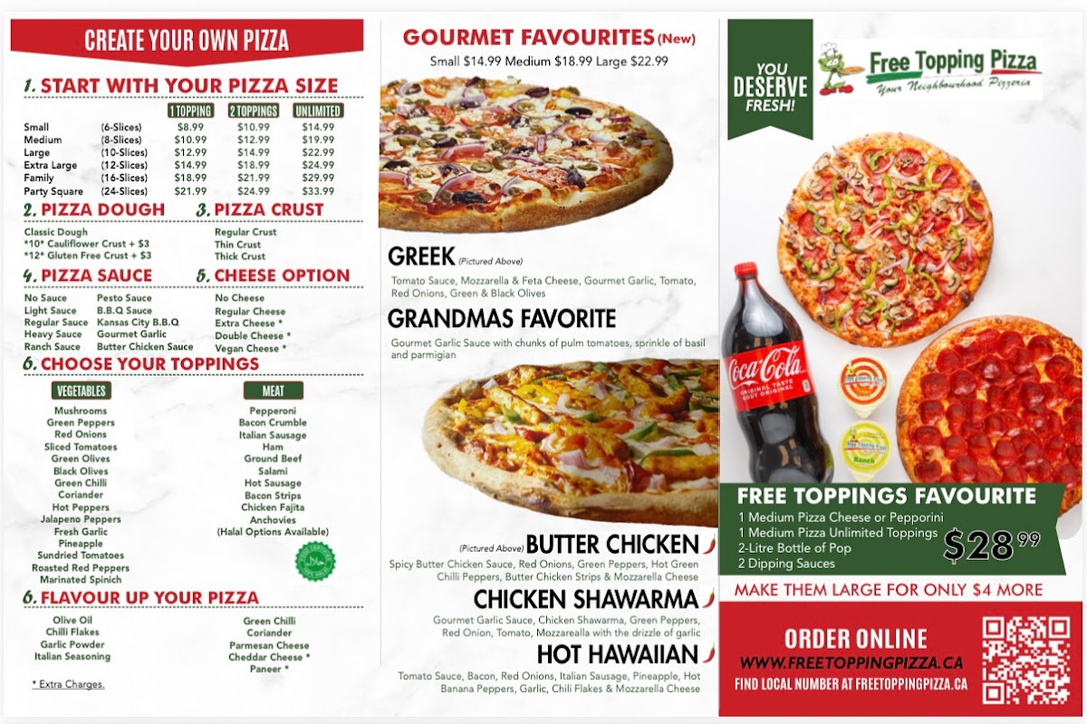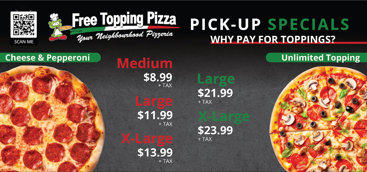 At Free Topping Pizza Pickering, the menu is all about letting you build the perfect pizza. Whether you're in the mood for something classic or craving a bit of adventure, there's no shortage of choices to satisfy your taste. With every pizza, you get the added bonus of free toppings, allowing you to customize your dish just the way you like it. From savory cheeses to fresh vegetables and hearty meats, the combinations are endless. The crust, perfectly crisp on the outside and soft on the inside, provides a solid foundation for whatever toppings you choose. Located at 376 Kingston Rd, Pickering, ON, the pizzeria offers a relaxed vibe, perfect for grabbing a quick bite or enjoying a leisurely meal with friends and family. Whether you're grabbing a slice to go or dining in, each order promises a satisfying and delicious experience.