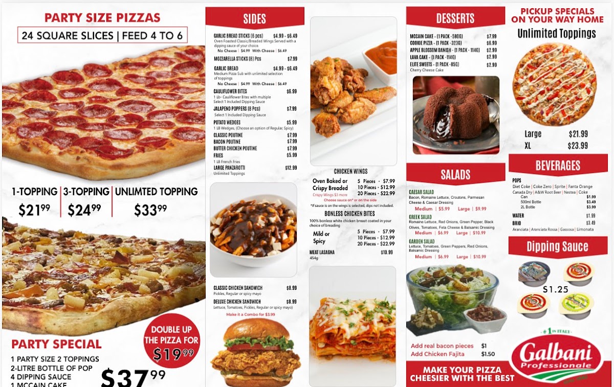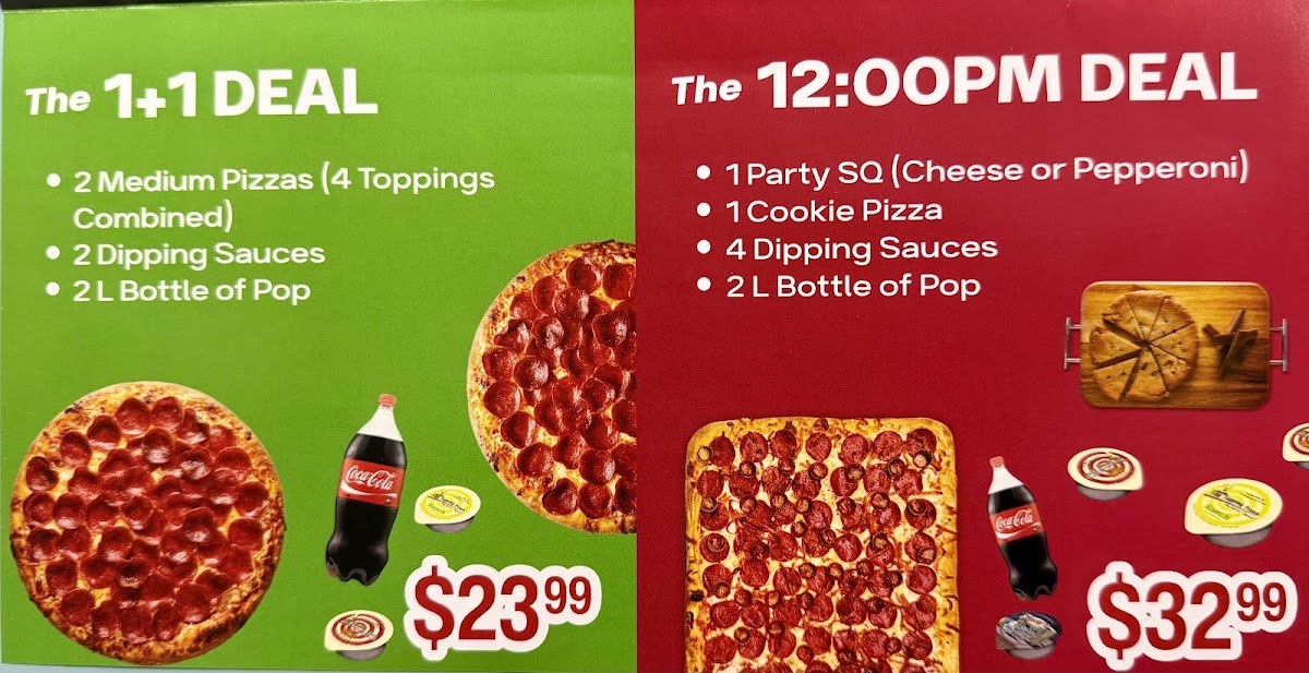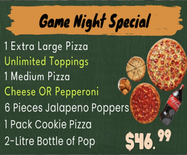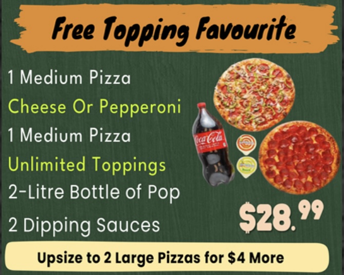 Extra large pizza unlimited free toppings, medium cheese or pepperoni pizza, jalapeno poppers (6 pcs). choc. chunk pizza cookie (323g) and 2-litre bottle of pop,